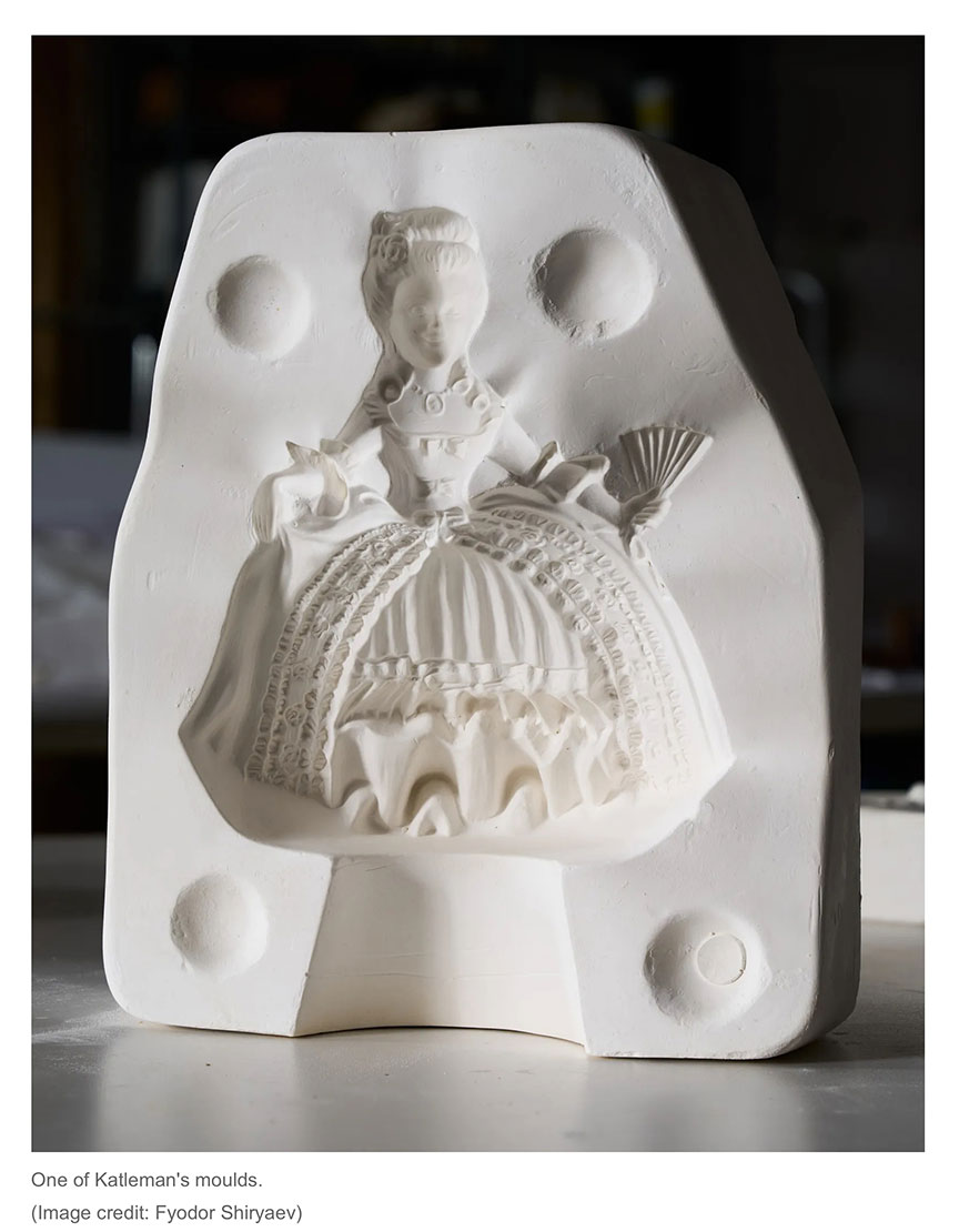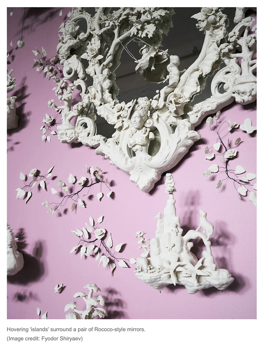 Beth Katleman is a Brooklyn-based ceramics artist. Her sculptural installations combine Rococo embellishments (floral motifs or whimsical themes) with storytelling and (sometimes dark) surprises. For instance, Beth’s “vanity” backdrop (comprised of 4500 porcelain pieces) for the The Victoria and Albert Museum’s Marie Antoinette Style features a bust of the namesake ruler adorned with a guillotine hair ornament.